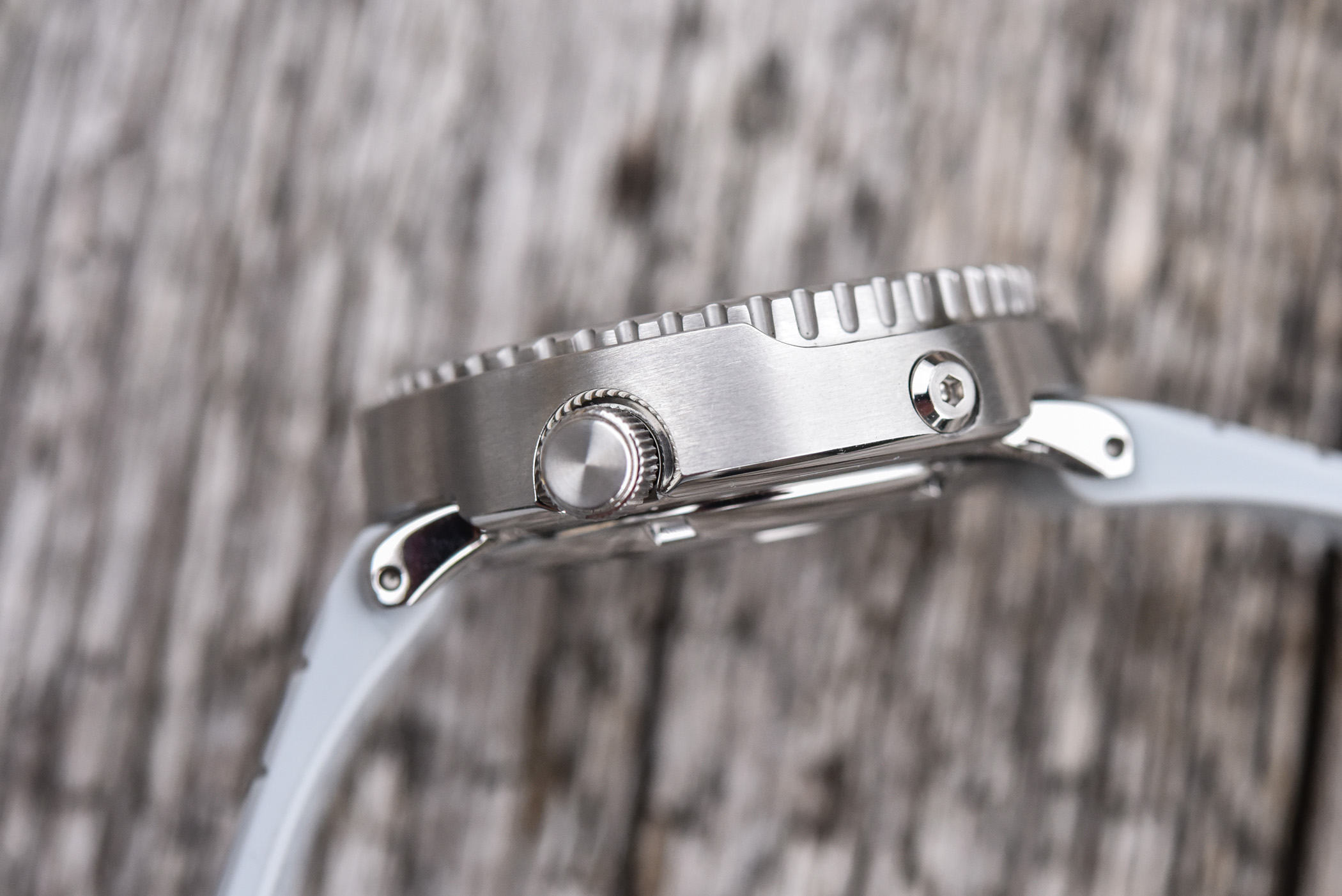 Корпус имеет типичный защитный корпус из матовой нержавеющей стали, который частично закрывает безель. Заводная головка, расположенная в положении «4 часа», завинчивается, а водонепроницаемость составляет 200 метров. Часы оснащены минеральным стеклом Hardlex.