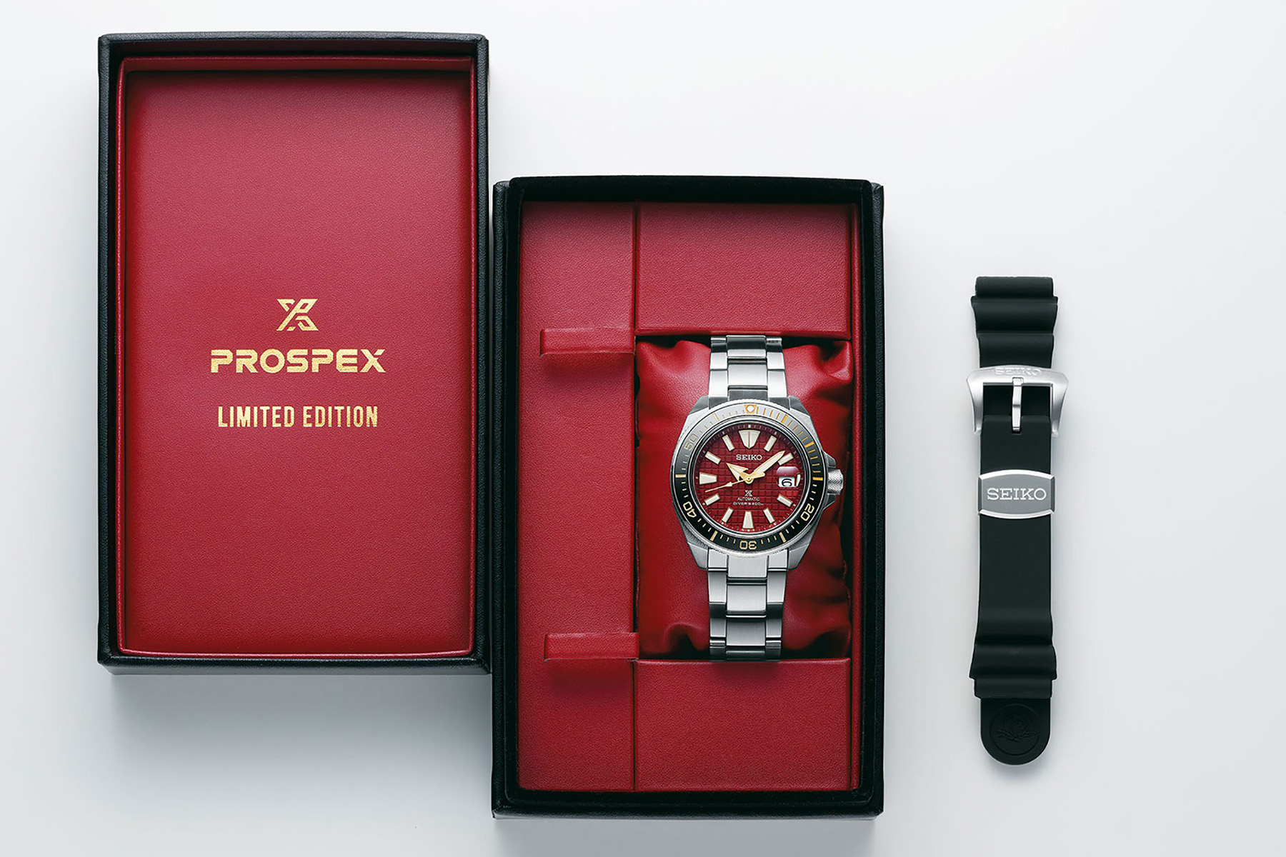 Модель Seiko Prospex King Samurai Shu-Iro SRPH61K1 браслет с тройной раскладывающейся застежкой и удлинителем для дайвинга. В комплект также входит дополнительный черный силиконовый ремешок со стальной пряжкой. Часы выпущены ограниченным тиражом в 3500 экземпляров, которые будут доступны исключительно в Европе с февраля 2022 года.